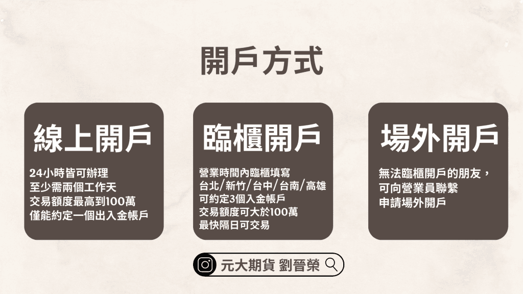 且臨櫃開戶可綁定最多3本入金帳戶,交易額度可隨時依您帳上的保證金做調整。